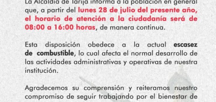 Uncategorized julio 29, 2025 CAUSA SORPRESA LA ALCALDÍA DE TARIJA AL ANUNCIAR HORARIO CONTINUO EN TODAS SUS DEPENDENCIAS POR FALTA DE COMBUSTIBLE La Alcaldía de Tarija sorprendió a la ciudadanía al anunciar que, desde el pasado 28 de julio, todas sus oficinas... 0 0CompartirTwittear0 Compartir