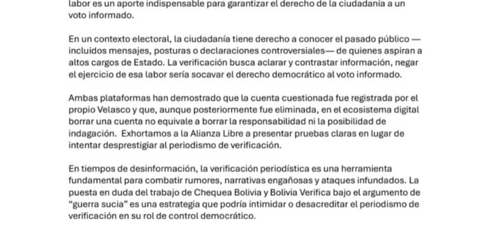 Uncategorized septiembre 30, 2025 ANPB RESPALDA EL TRABAJO DE CHEQUEA BOLIVIA Y BOLIVIA VERIFICA ANTE MENSAJES RACISTAS ATRIBUIDOS A CANDIDATO VICEPRESIDENCIAL La Asociación Nacional de Periodistas de Bolivia (ANPB) emitió un pronunciamiento en el que respalda el trabajo de Chequea Bolivia... 0 0CompartirTwittear0 Compartir