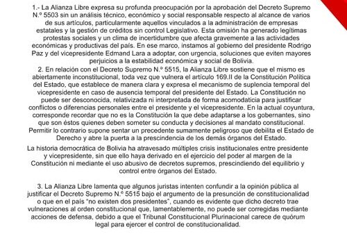 ALIANZA LIBRE ADVIERTE QUE PAZ QUIERE GOBERNAR AL MARGEN DEL PARLAMENTO Y LA CONSTITUCIÓN; Y AFIRMAN QUE LOS DECRETOS 5503 Y 5515 SON INCONSTITUCIONALES