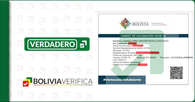 Bolivia Verifica escaneó el código QR de este documento y comprobó que Revollo figura como persona vacunada en la base de datos del Ministerio de Salud.