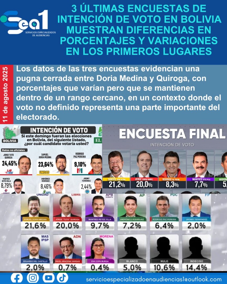 En resumen, los datos de las tres encuestas evidencian una pugna cerrada entre Doria Medina y Quiroga, con porcentajes que varían pero que se mantienen dentro de un rango cercano, en un contexto donde el voto no definido representa una parte importante del electorado. Esta situación sugiere que la decisión final podría depender en buena medida de la movilización de los indecisos y del comportamiento del voto residual en las próximas semanas previas a las elecciones del 17 de agosto.