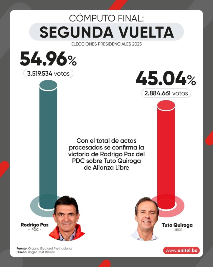 El binomio de Rodrigo Paz y Edmand Lara obtuvo 3.519.534 votos válidos (54.96%), mientras que Tuto Quiroga y Juan Pablo Velasco llegaron a 2.884.661 votos (45.04%).