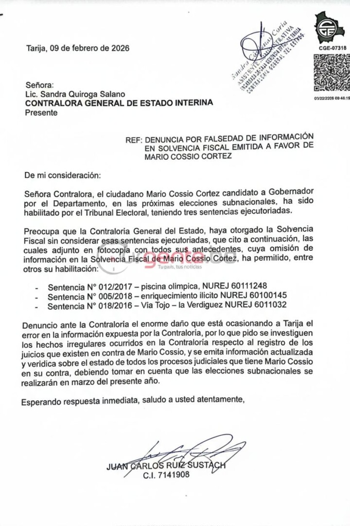 Un ciudadano presentó una nota ante la Contraloría General del Estado en la que pone en tela de juicio la emisión de la solvencia fiscal otorgada a Mario Cossío Cortez, documento que permitió su habilitación como candidato a la Gobernación de Tarija por parte del Tribunal Departamental Electoral (TDE).