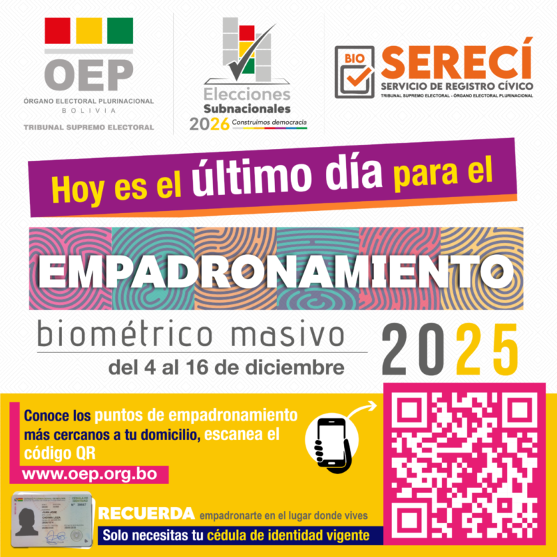 El Tribunal Supremo Electoral (TSE) anunció que este martes 16 de diciembre concluye el empadronamiento masivo para las Elecciones Subnacionales 2026 e instó a la ciudadanía a acudir a los puntos habilitados en todo el territorio boliviano.
