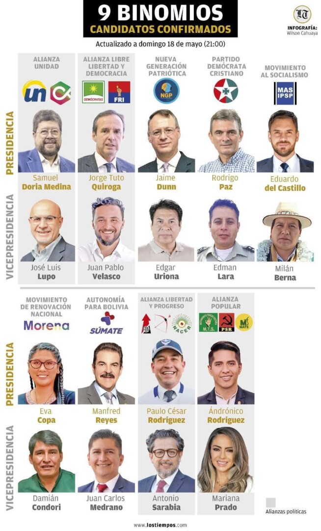 A un día del cierre de las inscripciones de candidaturas presidenciales, hay al menos nueve candidatos confirmados. Sin embargo solo dos se inscribieron formalmente en el Tribunal Supremo Electoral (TSE). En el resto hay dos candidatos cuyos binomios aún no están completos.