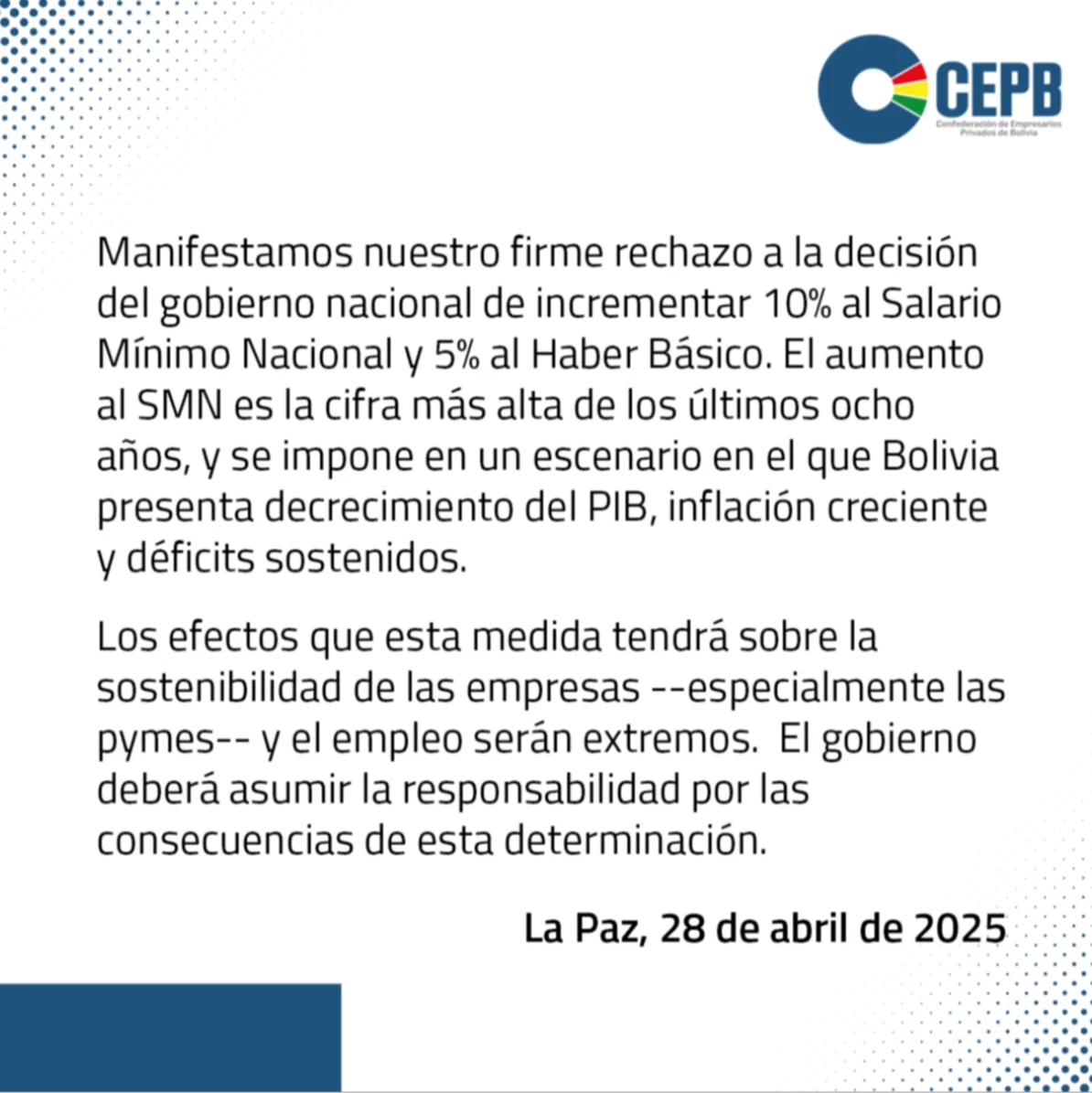 La Confederación de Empresarios Privados de Bolivia (CEPB) emitió un comunicado en el que expresa su firme rechazo al incremento salarial anunciado por el Gobierno nacional tras un acuerdo con la Central Obrera Boliviana (COB). El aumento contempla un 10% al Salario Mínimo Nacional (SMN) y un 5% al haber básico, una medida que, según los empresarios, afectará gravemente la sostenibilidad de las empresas, particularmente las pequeñas y medianas (pymes).“El aumento al SMN es la cifra más alta de los últimos ocho años, y se impone en un contexto en el que Bolivia experimenta decrecimiento del PIB, inflación creciente y déficits fiscales sostenidos”, señala el pronunciamiento del sector privado.