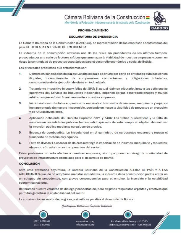 La crisis que afecta a Tarija es parte de una problemática mayor. La Cámara Boliviana de la Construcción (CABOCO), en representación de las empresas constructoras de todo el país, ya emitió una declaratoria de emergencia a nivel nacional, advirtiendo que la falta de pagos, el incremento de costos, la escasez de combustible, la falta de dólares y la presión impositiva ponen en riesgo la continuidad de proyectos estratégicos para el desarrollo económico y social de Bolivia.