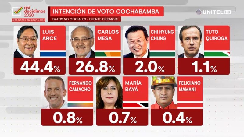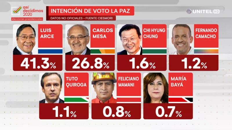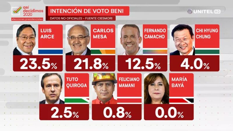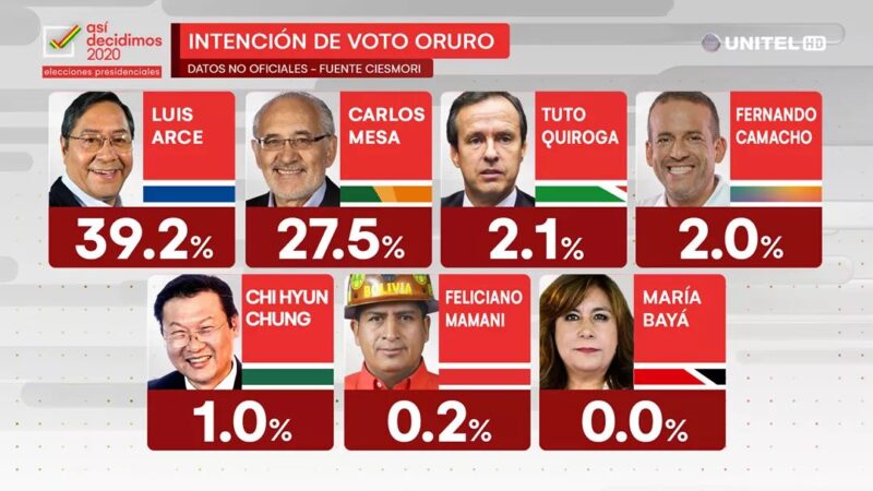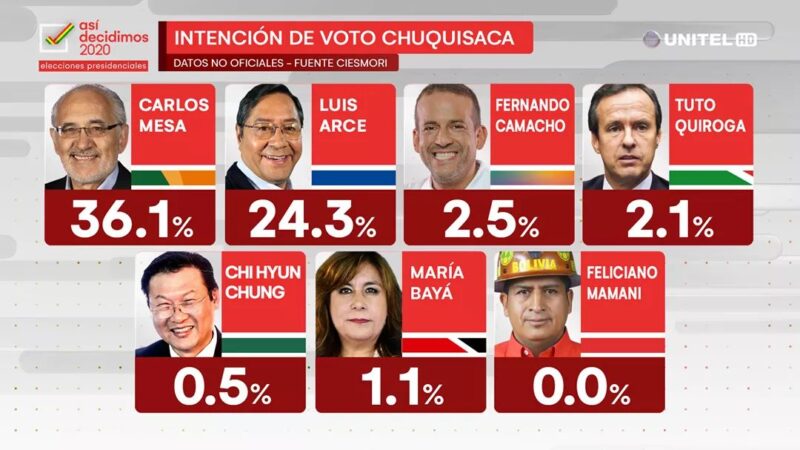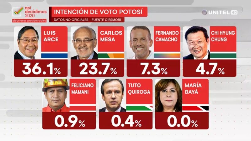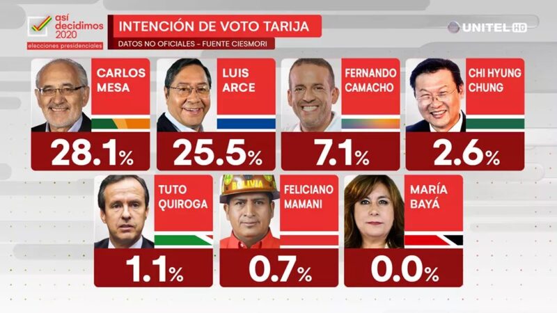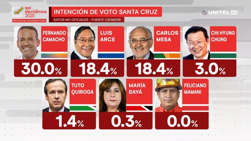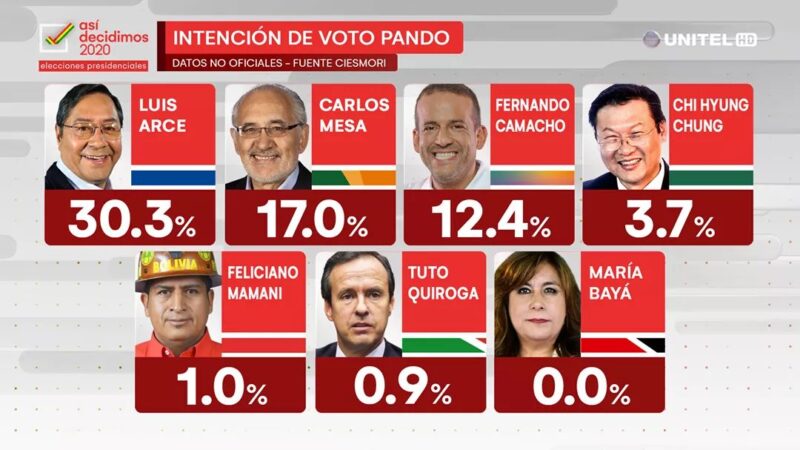ENCUESTA CIESMORI POR DEPARTAMENTO: ARCE GANA EN 6, MESA EN 2 Y CAMACHO EN UNO