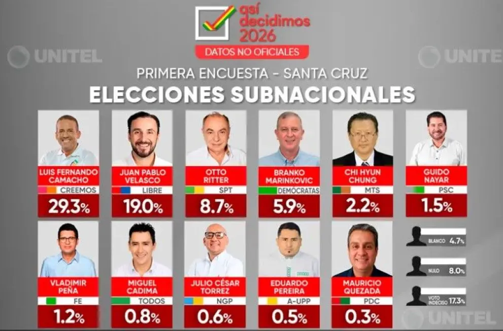 La red televisiva Unitel presentó la noche de este jueves los resultados de su primera encuesta nacional de intención de voto rumbo a las elecciones subnacionales del 22 de marzo de 2026. El estudio fue realizado por la empresa Ipsos CIESMORI entre el 6 y el 15 de febrero, con un total de 14.737 encuestas en áreas urbanas y rurales de los departamentos de La Paz, Cochabamba y Santa Cruz.