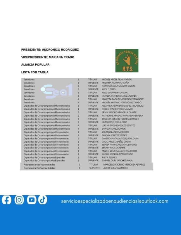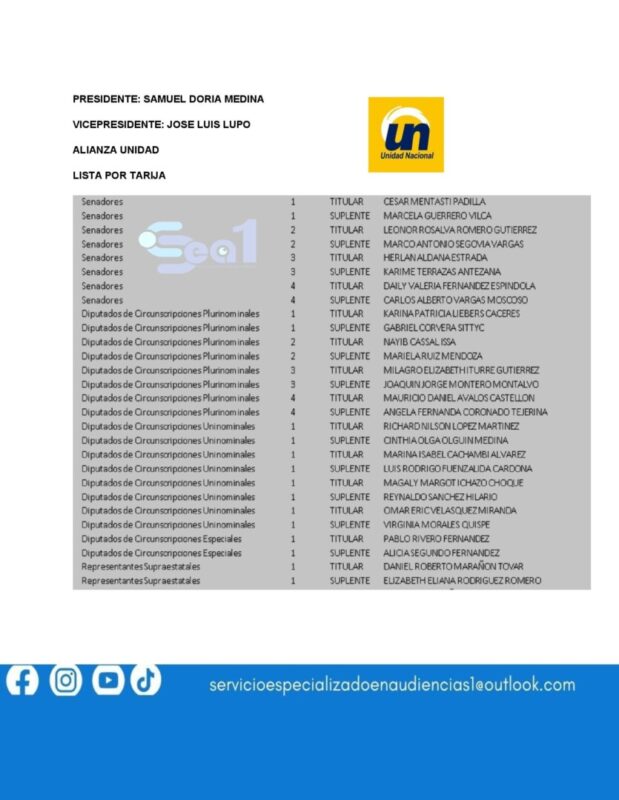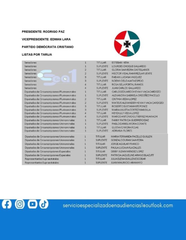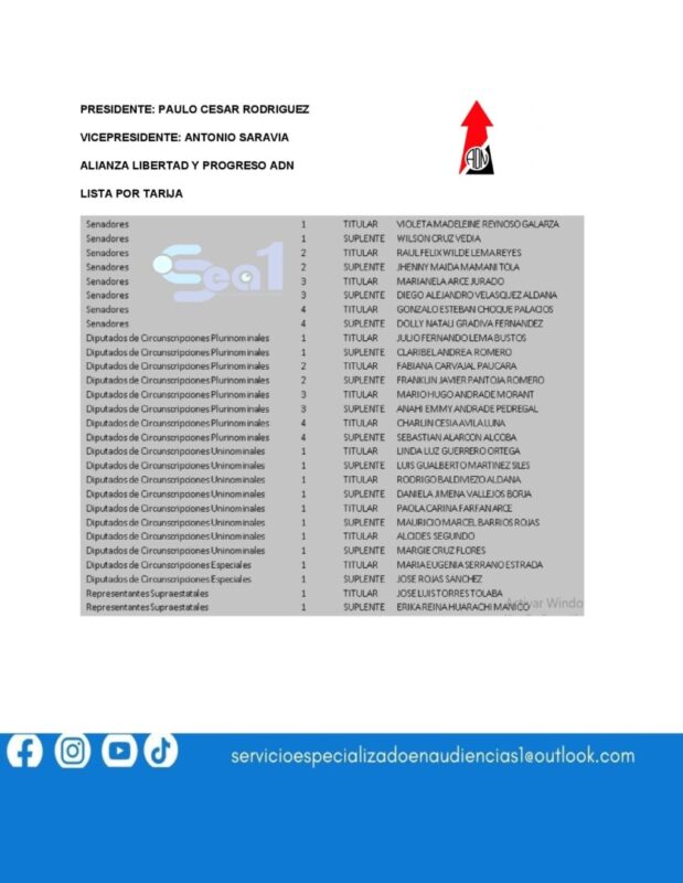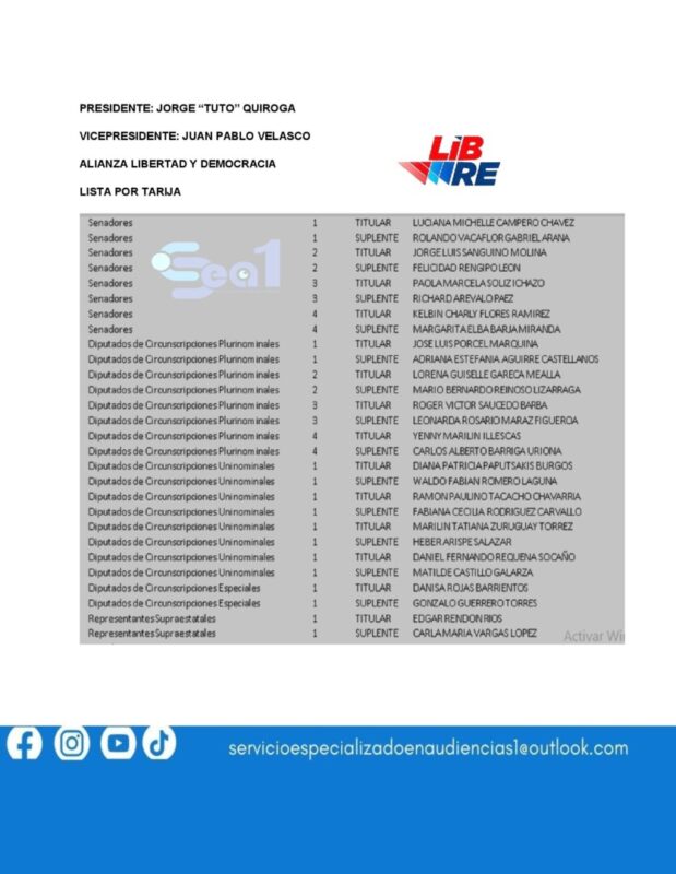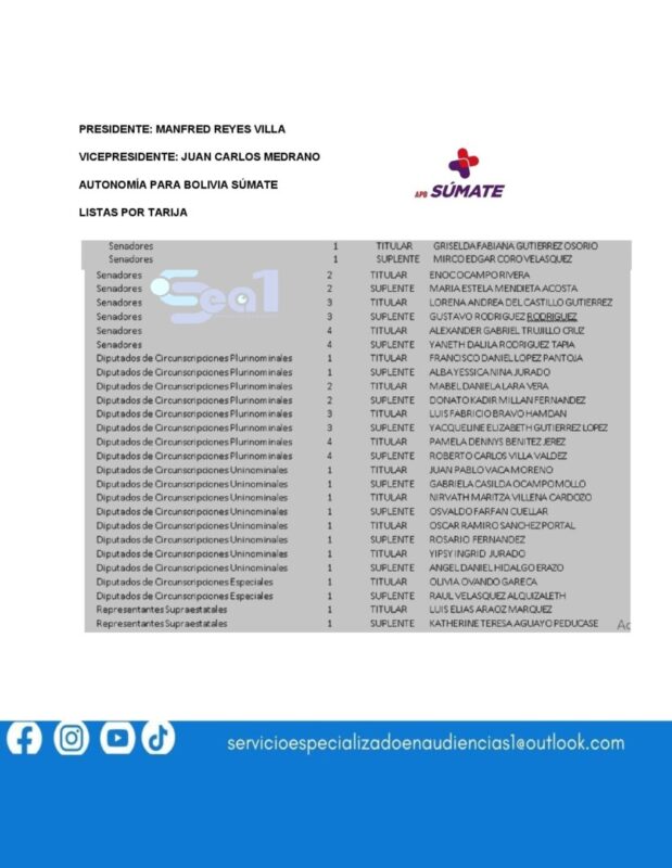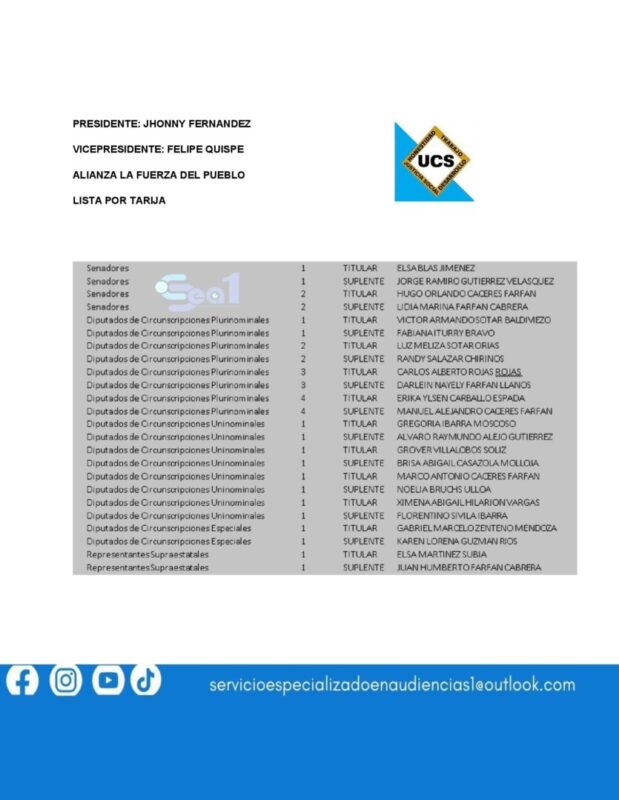 ESTA ES LA LISTAS DE CANDIDATOS A DIPUTADOS Y SENADORES POR TARIJA PRESENTADAS POR LOS 10 FRENTES POLÍTICOS