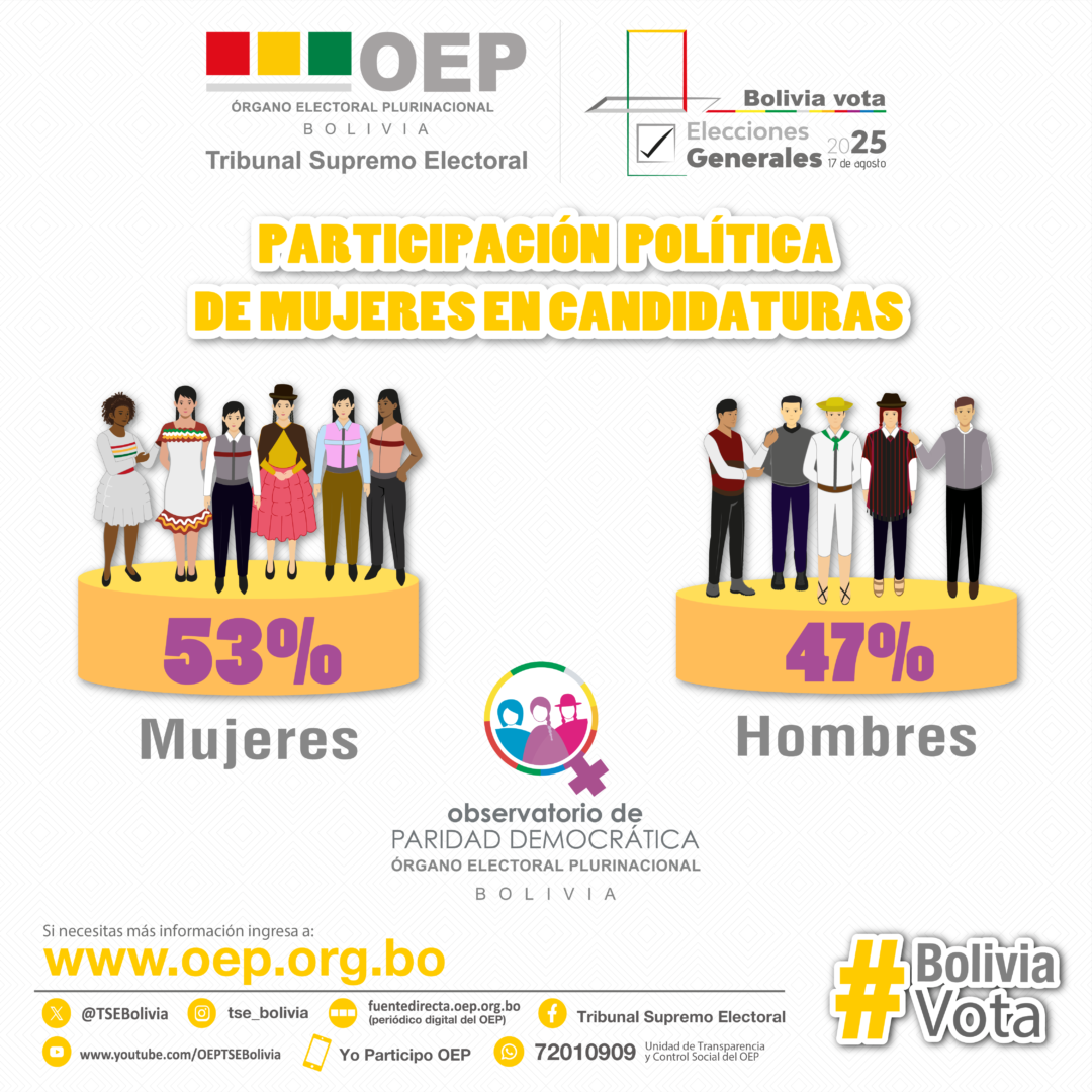 Bolivia da un paso significativo hacia la equidad de género en la política: la participación de mujeres en las candidaturas titulares para las Elecciones Generales 2025 alcanzó el 53 %, superando por primera vez el porcentaje de candidatos hombres, quienes representan el 47 %, según el Observatorio de Paridad Democrática del Tribunal Supremo Electoral (TSE).
