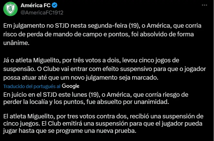 Pese a que el árbitro no escuchó directamente los insultos, el protocolo antirracismo fue activado en el estadio Germano Krüger y se inició una investigación oficial. El tribunal resolvió, por una votación de tres contra dos, imponerle una sanción deportiva de cinco partidos y una multa económica. No obstante, el club América Mineiro fue absuelto por unanimidad de cualquier responsabilidad institucional en el caso.