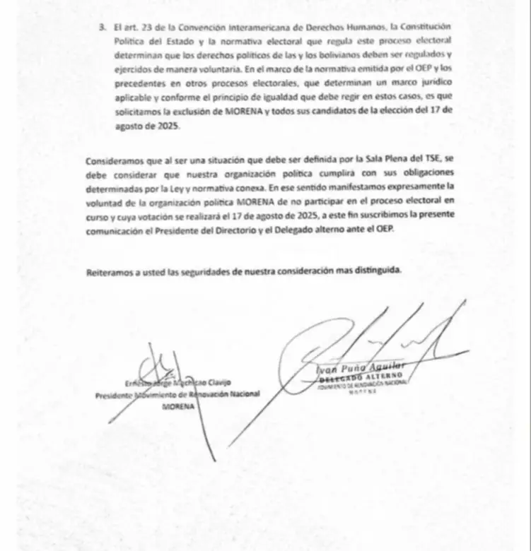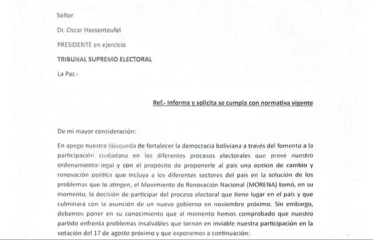 MORENA FORMALIZA ANTE EL TSE SU RENUNCIA A PARTICIPAR EN LAS ELECCIONES GENERALES