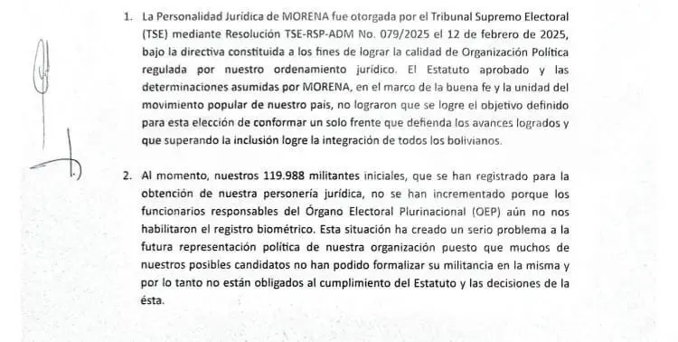 La nota, dirigida al presidente del TSE, Óscar Hassenteufel, fue firmada por el jefe nacional del partido, Jorge Macchicao, y el delegado alterno, Iván Puña. En ella, solicitan la exclusión del proceso electoral, argumentando que la falta de habilitación del registro biométrico impidió incorporar nuevos militantes a la organización.