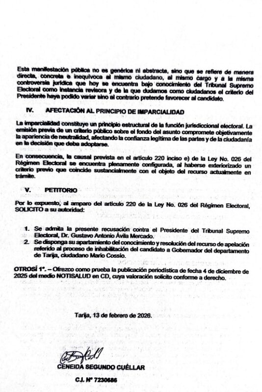 En el documento se solicita: “1) se admita la presente recusación contra el Presidente del Tribunal Supremo Electoral, Gustavo Antonio Ávila Mercado. 2) Se disponga su apartamiento del conocimiento y resolución del recurso de apelación referido al proceso de inhabilitación del candidato a Gobernador del departamento de Tarija, Mario Cossio”.
