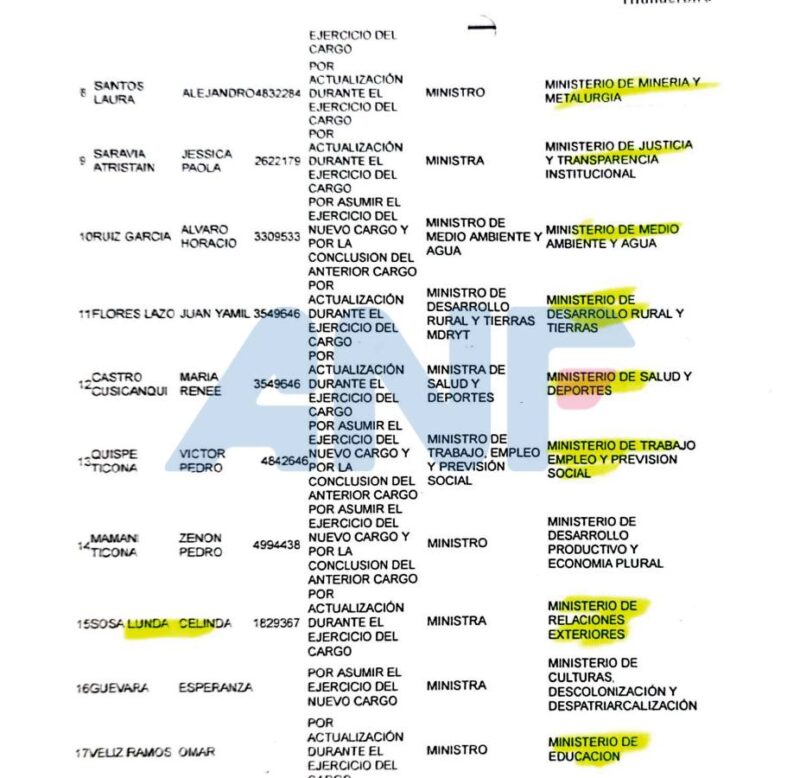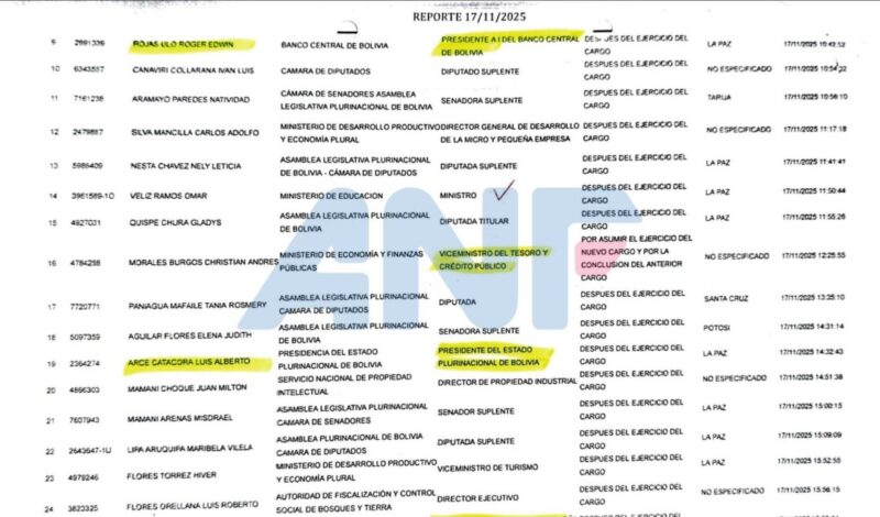 En la lista figuran desde el expresidente Luis Arce, sus ministros, ejecutivos de entidades estatales, concejales, parlamentarios, entre otros.