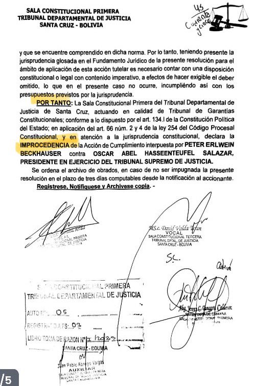 ”La Sala Constitucional Primera del Tribunal Departamental de Justicia de Santa Cruz (…) declara la improcedencia de la acción de cumplimiento interpuesta por Peter Erlwein”, señala parte de la resolución de la Sala Constitucional Primera de Santa Cruz.