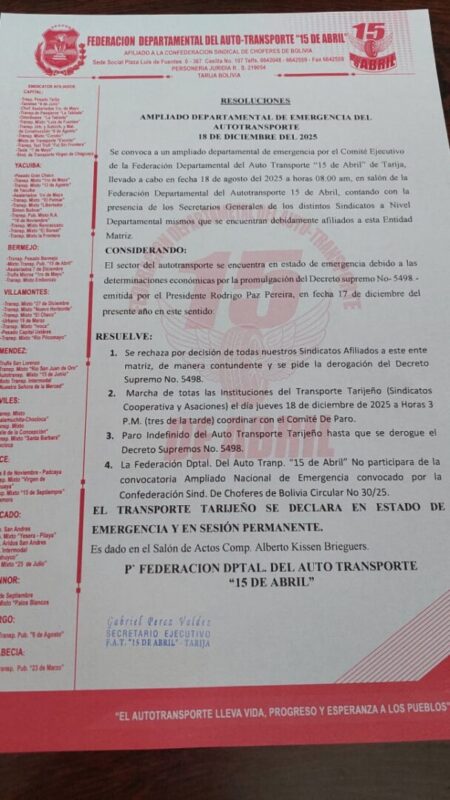 Entre las decisiones adoptadas, el sector anunció además una marcha de todas las instituciones del transporte tarijeño (sindicatos, cooperativas y asociaciones) para este jueves 18 de diciembre a horas 15:00, coordinada con el Comité de Paro. Asimismo, advirtieron que, de no derogarse el Decreto Supremo N.º 5498, se iniciará un paro indefinido del autotransporte en Tarija.