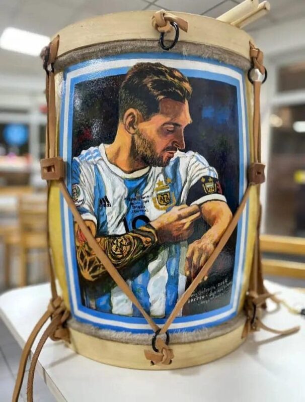 Allí fue Matías acudió al luthier Luis Quiroga, junto a quien pergeñó la idea de fabricar un bombo personalizado para Lionel. El hombre aceptó el desafío y el resultado final fue un impresionante instrumento argentino que en su cuerpo tiene grabada una gigantografía del delantero con la camiseta de la Selección argentina.