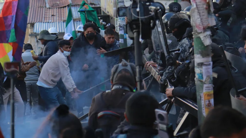 La movilización ‘evista’ llegó hasta el centro de la ciudad de La Paz e intenta ingresar a Plaza Murillo, trataron de romper el cordón policial y fueron dispersados con el uso de agentes químicos.